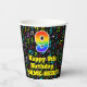 This fun and exciting music themed birthday paper cup design features a large number “9” having a rainbow spectrum gradient inspired pattern. It also features the message “Happy 9th Birthday,”, and an editable name. The background features a colourful pattern of various music notes and symbols having a variety of sizes and colours. Colourful, vibrant paper cups like this might be fun to have at a birthday celebration being held in celebration of somebody’s ninth birthday. [~Z0000541]