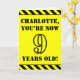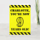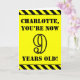 The front of this attention-grabbing and bold birthday themed greeting card design features an editable name and the message "YOU’RE NOW 9 YEARS OLD!" in black stencil style text on a yellow colored background. There is also an eye-catching black and yellow stripes pattern at the top and bottom edges of the front. The inside features a personalized birthday greeting message, or could perhaps be cleared and left blank if a message is to be written by hand instead. A personalized birthday card like this might be a fun way to acknowledge somebody’s ninth birthday. [~Z0000413]