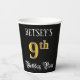 This fancy and ornate birthday themed paper cup design features a customisable name and the message “9th Birthday Party”. The large number “9th” has an imitation/faux gold-inspired colouring pattern, the words “Birthday Party” are in opulent script-style text, and the background is coloured black by default (although it can be customised). Elegant, luxurious paper cups like this might be useful at a birthday party/celebration being held to honour somebody’s 9th birthday. [~Z0000567]