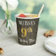 This fancy and ornate birthday-themed paper cup design features a personalised name and the message “9th Birthday Party”. The large number “9th” features an imitation/faux gold-inspired colouring pattern, and the words “Birthday Party” are in elegant script-style text. The background features an imitation/faux woodgrain-inspired appearance. Luxurious, opulent paper cups like this might be used at a birthday party/celebration being held to celebrate somebody’s ninth birthday. [~Z0000568]