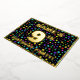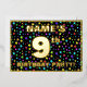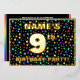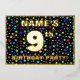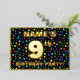 The front of this joyful ninth birthday celebration/party foil invitation card design features a custom name, a large number “9th”, the message “BIRTHDAY PARTY!”, and a border. The background of the front features an eye-catching, multicolored pattern of star shapes. The back features personalised details about the event, such as the date, time, place/venue, and any other important information. Customisable invitations like these might be a fun way to invite guests/attendees to a birthday party being held in celebration of somebody’s 9th birthday. [~Z0000600]