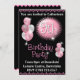 9th Birthday Party Invitation with balloons. Pink & black colour scheme.