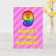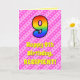 The front of this festive and happy 9th birthday-themed greeting card design features a large number "9" having a colorful rainbow spectrum inspired gradient pattern. It also features the message "Happy 9th Birthday,", followed by a personalized recipient name. The background of the front features a light pink and dark pink stripes pattern containing loving pink heart shapes. The inside features a personalized birthday greeting message, or could perhaps be cleared and left blank if a message is to be written by hand instead. A personalized birthday card like this might be a fun way to acknowledge somebody’s ninth birthday. [~Z0000416]
