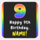This bold and upbeat birthday themed square sticker design features the number “9“ with a multicolored rainbow spectrum inspired gradient pattern, along with the message “Happy 9th Birthday,”, and a custom recipient name. Fun birthday themed stickers like these might be given out or used at a party celebrating somebody’s ninth birthday, or perhaps used when preparing invitations or gifts/presents for such an event. [~Z0000630]
