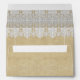 A7 Size Envelope, for 5" x 7" invite. NOTE: this is a flat printed design, there are no raised lace, fabric or layered elements on this product. COLOR PALETTE: white, tan, burlap DESIGN COLLECTION: Matching two sided, printed, return address square wedding invitation envelope. This is a modern BOHO or Bohemian Style, gypsy inspired, trendy chic stylish look. It has a simple, clean yet lovely beauty. Created from vintage Victorian or Edwardian era swirl baroque deep drop leaf lace pattern and tear drop design ornaments that have been graphically hand transformed into an elegant beautiful, sophisticated lace trim border. The laces are laid on top of a tea stained burlap textured background pattern. A complete wedding invitation set is available to match. The reverse side has the tear drop, diamond swirl point lace pattern in a full repeat pattern.