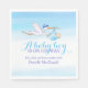 Baby shower baby boy being delivered by stork paper disposable napkins. Cute whimsical baby shower design. A great personalised addition a baby boy showering party. Reads A baby boy is on his way Eat, drink and honour mother to be Danielle MacDonald. Unique watercolor painting and design by Sarah Trett. www.sarahtrett.com