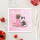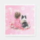 Girl's baby shower napkins. Sweet baby girl sitting next to her little black and white Mini Aussie puppy dog in a patch of pretty watercolor flowers. Pink and blue butterflies and pretty wildflowers.