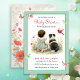 Girl's baby shower invitations. Sweet baby girl sitting next to her little black puppy dog in a patch of pretty watercolor flowers. Sage green and red wildflowers and butterflies background.