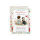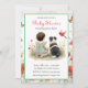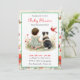 Girl's baby shower invitations. Sweet baby girl sitting next to her little black puppy dog in a patch of pretty watercolor flowers. Sage green and red wildflowers and butterflies background.