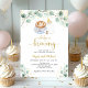 This invitation features watercolor greenery with coffee, a baby bottle and gold foil accents.