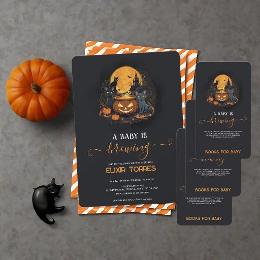 An enchanting Halloween baby shower collection titled "A Baby Is Brewing," featuring cute cauldrons, pumpkins, cats and bats. This collection blends whimsical witchy elements with the excitement of a new arrival, perfect for invitations, decorations, and party favours that add a touch of magic and fun to your baby shower celebration. If you need any other matching product or customisation, kindly message via Zazzle.