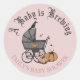 Personalised "A Baby is Brewing" Halloween Baby Shower favour sticker, featuring hand-drawn baby carriage, crow and pumpkins against an elegant blush pink background. Ideal for decorating favour bags, boxes and envelopes. Simply click on "Personalise this template" to insert your own name.