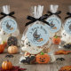 Personalised "A Baby is Brewing" Halloween Baby Shower favour sticker, featuring hand-drawn baby carriage, crow and pumpkins against a French blue background. Ideal for decorating favour bags, boxes and envelopes. Simply click on "Personalise this template" to insert your own name.