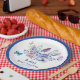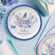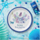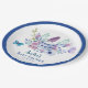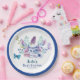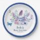 A baby is brewing tea party baby shower paper plates.This gender neutral baby shower features teacups with purple,blue and pink flowers and butterflies with a macaron.A perfect gender neutral rustic baby shower tea party theme.