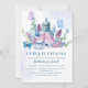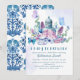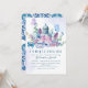 It's time for tea with the mum to be! This modern and elegant script typography baby shower invitation features a vintage style teapot kettle with watercolor flowers in blue,purple and pink with botanical foliage leaves and greenery with watercolor blue background.A Perfect baby shower tea party invitations.The back of the card is blue and white antique pattern.