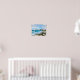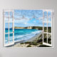 Pictured looking through a window is a glorious beach scene with high cliffs, white sand and gentle waves rolling on aqua blue sea waters
