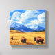 A beautiful landscape with two bison walking through a field of tall, golden grass. The sky is a brilliant blue with fluffy white clouds, and a distant mountain range with snow-capped peaks can be seen in the background. The overall impression is one of peace and tranquillity.