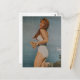 A beautiful woman from a a magazine photo from 1957 poses in her swimsuit on the beach.