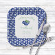 This is a customisable baby shower paper plate with a charming blueberry theme. The design features a blue border adorned with white daisy-like flowers, framing a central white square. Inside the square, there is an illustration of blueberries with green leaves, adding a playful and sweet touch. The text, written in a mix of cursive and print fonts, reads: "A berry sweet boy is on the way!" Below, in a complementary font, it displays the honoree’s name and the event date. The napkin has a fresh, whimsical, and fun aesthetic, perfect for a blueberry or fruit-themed baby shower. It is customisable, allowing for the name and date to be personalised to fit any celebration.