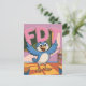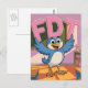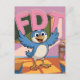 A blue bird holds up the letters that they are learning today F,D, and T in pink letters funny AI generated art