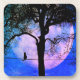 Fantastic full moon of purple hues and cobalt blue skies with a black cat on wire looking at it