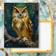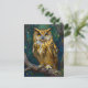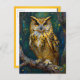A beautiful postcard to say hello and keep in touch with friends and family with a gold and blue owl sitting on a tree branch. This illustration has an impasto oil painting style.