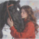 A serene winter scene captures a tender moment between a young woman and her loyal horse. Clad in a warm red coat, she gently rests her forehead against the horse’s, their breath mingling in the crisp, snow-filled air. The golden hues of the background contrast with the falling snowflakes, evoking a sense of peace, trust, and quiet companionship in nature’s embrace.