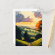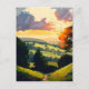 This work of art as the sun sets over the horizon, casting a warm orange glow across the sky, catching the wind and flowing through the trees on the green hills below.