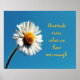 A single white daisy with a golden yellow centre under a clear blue summer sky. Quotation which says "gratitude turns what we have into enough".