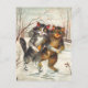 Vintage illustration of a cute anthropomorphic cat couple holding hands and ice skating, having a merry time in the winter. How romantic!