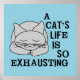 A cat's life is so exhausting text with the image of a sleeping grey cat, with a smile on it's face, is a funny design for cat lovers.