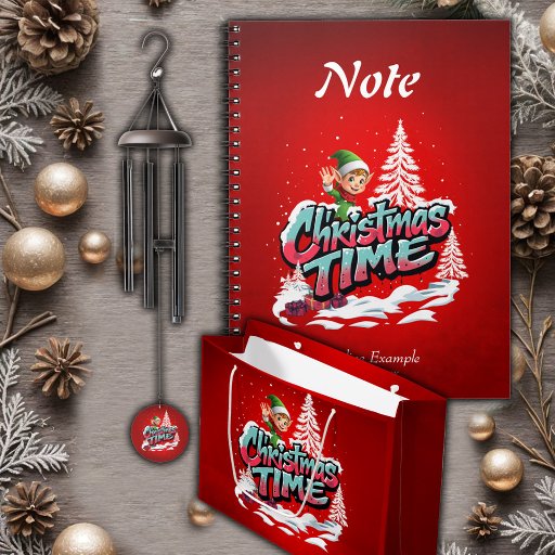 A cheerful cartoon elf with green clothing and pointy ears waves from a snowy landscape. The words "Christmas Time" are written in large, colourful, graffiti-style lettering, with a pink and blue colour scheme. The background is a bright red, suggesting a festive holiday atmosphere. Snowflakes fall gently, adding to the wintery feel.