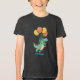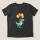 A cheerful cartoon dinosaur soaring through the air, lifted by colourful balloons. This fun and whimsical illustration is perfect for kids' products, greeting cards, party themes, and playful designs. The image conveys joy, imagination, and lighthearted fun.