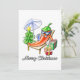 Merry Christmas reads this hand-drawn design, a party present for Christmas in July or December. A funny, cute cartoon character of a red jalapeño pepper is chilling out on a beach lounger under a sunshade between a xmas tree and wrapped gifts.