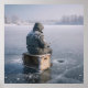 A person sits on a crate, ice fishing on a vast frozen lake. Snow gently covers their winter attire, creating a serene winter scene.