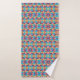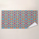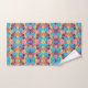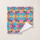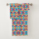 A colorful towel and washcloth set featuring a vibrant geometric pattern of pink, blue, yellow, and orange. The design is symmetrical and eye-catching.
