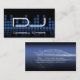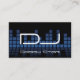 A cool dj businesscard template with a stunning design of blue equalizer laser lights in the night sky combined with black backlight music notes on a dark background. The perfect card for a professional DJ or Producer.