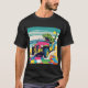A pop art image of a crocodile driving a beach buggy, with the sun setting in the background on a serene beach.