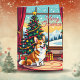 An adorable Christmas card with a festive Corgi sitting in front of the fireplace on a cold winter day. A Christmas tree decorated and a festive background. A sweet holiday poem inside.