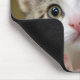 A mousepad with a tabby kitten with green eyes, with a blurry background