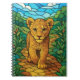 A cute lion cub walks down a dirt path in a forest. The art is digitally created and is stained glass themed.