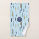 This whimsical boating themed hand towel features varied size seafaring vessels on a light blue background with custom monogram on a dark blue circle pendant - the pattern includes 2 cargo ships, 2 sailing vessels, 2 antique-style wood boats, 1 fishing boat, a rowboat and a houseboat - close inspection of the pattern reveals people enjoying "A Day On the River" © katz_d_zynes 2020