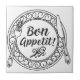 a black and white illustration of a bon appetit sign with a fork and knife surrounding a decorative plate. the design is ornate and elegant, perfect for a restaurant or kitchen decor
