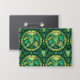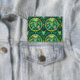 A decorative wall art piece features a repeating pattern of vibrant green tropical leaves within circular stained glass frames against a dark background. The design creates a harmonious and lush feel, evoking a sense of tranquility and nature. The wall art is shown from the front, with another view displaying the mount behind it.