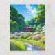 This captivating digital artwork showcases a small Japanese house, surrounded by a beautiful garden filled with vibrant pink and white flower bushes. The gentle and unobtrusive stream flowing in front of the house adds to the beauty of the scene, creating a quiet and peaceful ambiance.