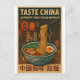 "Retro travel-style poster featuring a delicious bowl of traditional Chinese noodles — hand-pulled la mian or dan dan noodles — served steaming hot in a blue and white porcelain bowl 2025