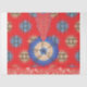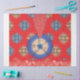 The design features a stunning fractal pattern. At the centre, there’s a circular motif in blue and white, surrounded by intricate designs in shades of orange, brown, and blue. The background is a rich red with gold star-like patterns scattered throughout. This symmetrical fractal design is visually captivating and often symbolises infinite complexity, whether in mathematics, nature, or art.