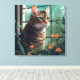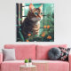 The cat gazes outside with a curious expression that will charm any viewer. The artwork is an illustration made with bold colors and a stylized technique, making it a distinctive and attractive piece of home decor.