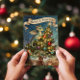 A small, adorable dragon with shimmering teal and gold scales perches carefully on the branches of a glowing Christmas tree. Its wings are delicate and slightly translucent, and it’s gently hanging a red ornament with its tiny claws. The tree sparkles with colorful baubles and golden fairy lights, crowned with a shining star at the top. Behind them, a deep blue night sky twinkles with stars, and a ribbon above the dragon reads “Merry Christmas” in elegant script.