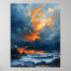 This painting depicts a dramatic seascape at sunset. The sky is filled with vibrant colours, with deep blues and purples contrasting with fiery oranges and yellows. Dark storm clouds contrast with the bright sunset, creating a sense of tension and drama.